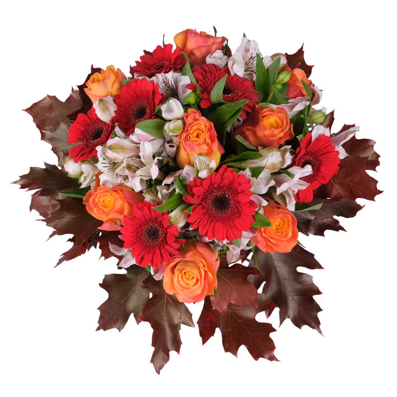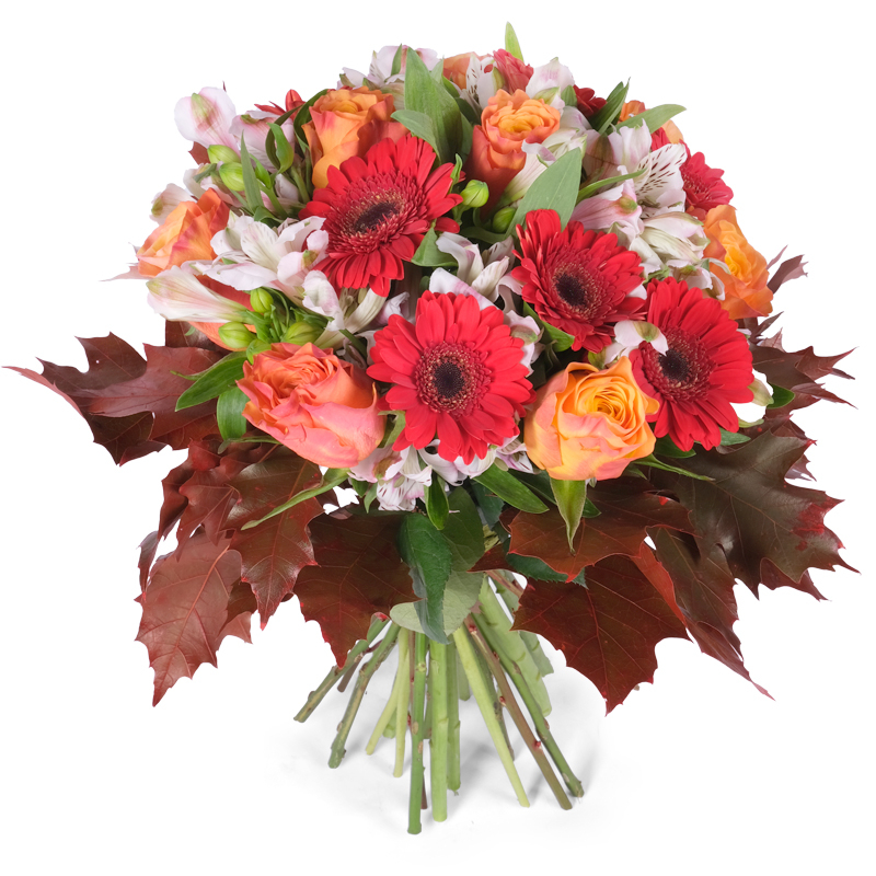 Bukiet przenoszący magię jesiennego spaceru do domu. Róże wnoszą ciepło i romantyzm, gerbery dodają energii krótszym dniom, alstromerie równoważą całość. Liście tworzą naturalną ramę jak w październikowym parku. To idealny prezent dla każdego, kto kocha jesień!